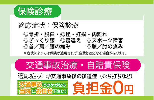 けがなどの原因があって、骨折・脱臼・捻挫・打撲・挫傷と判断されたものには健康保険が使えます。 来院されるときには、必ず保険証をお持ちください。 |